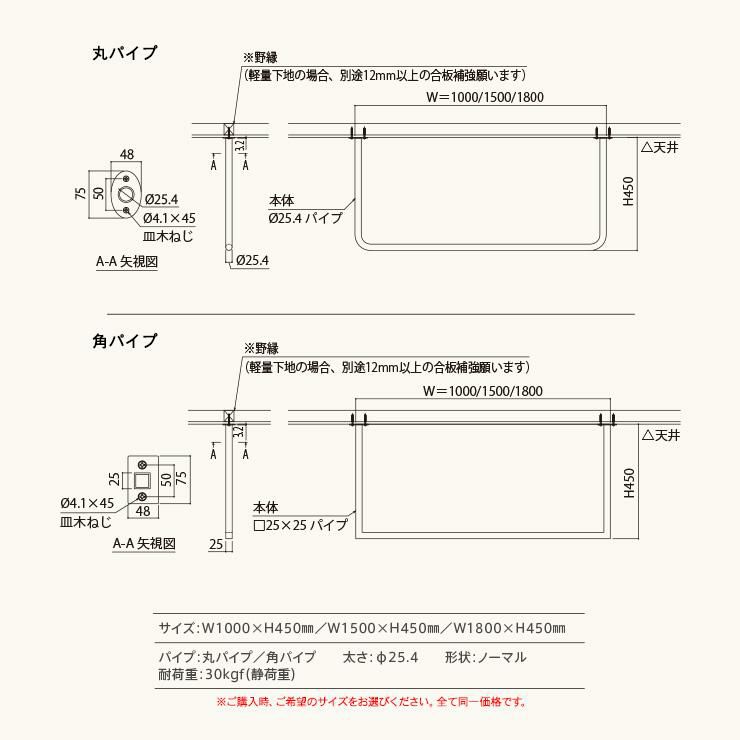 パイプ:丸パイプ(Φ25.4)/角パイプ(□25) 木下地固定用皿木ねじ同梱