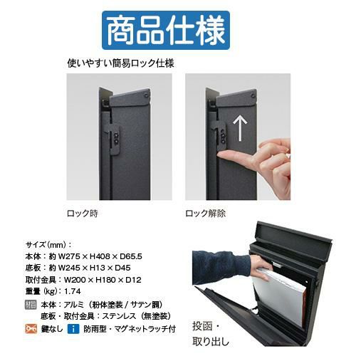 シンプルポストユニット 1型 照明なし本体 T13型ポスト(簡易錠) セット 上入れ前出し