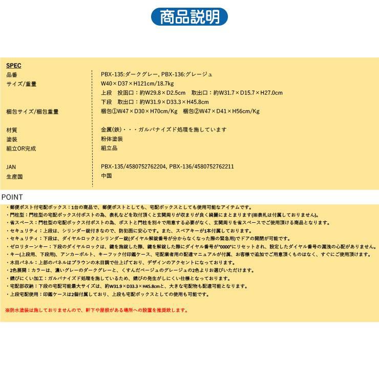 不在を知らせてしまう可能性に配慮した化粧扉付きで「宅配ボックスに荷物が入っている=不在」と思わせない設計です。複数受け取り可能かつポスト付で機能も一級品です。