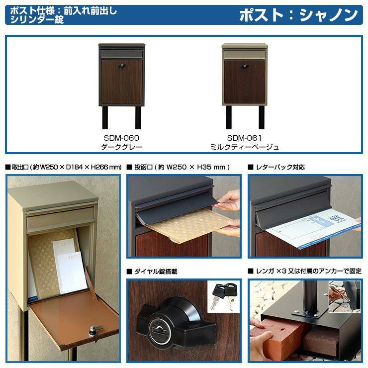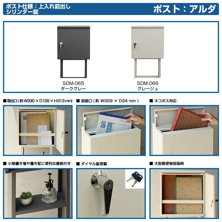 シンプルポストユニット 1型 照明なし本体 T13型ポスト(簡易錠) セット 上入れ前出し