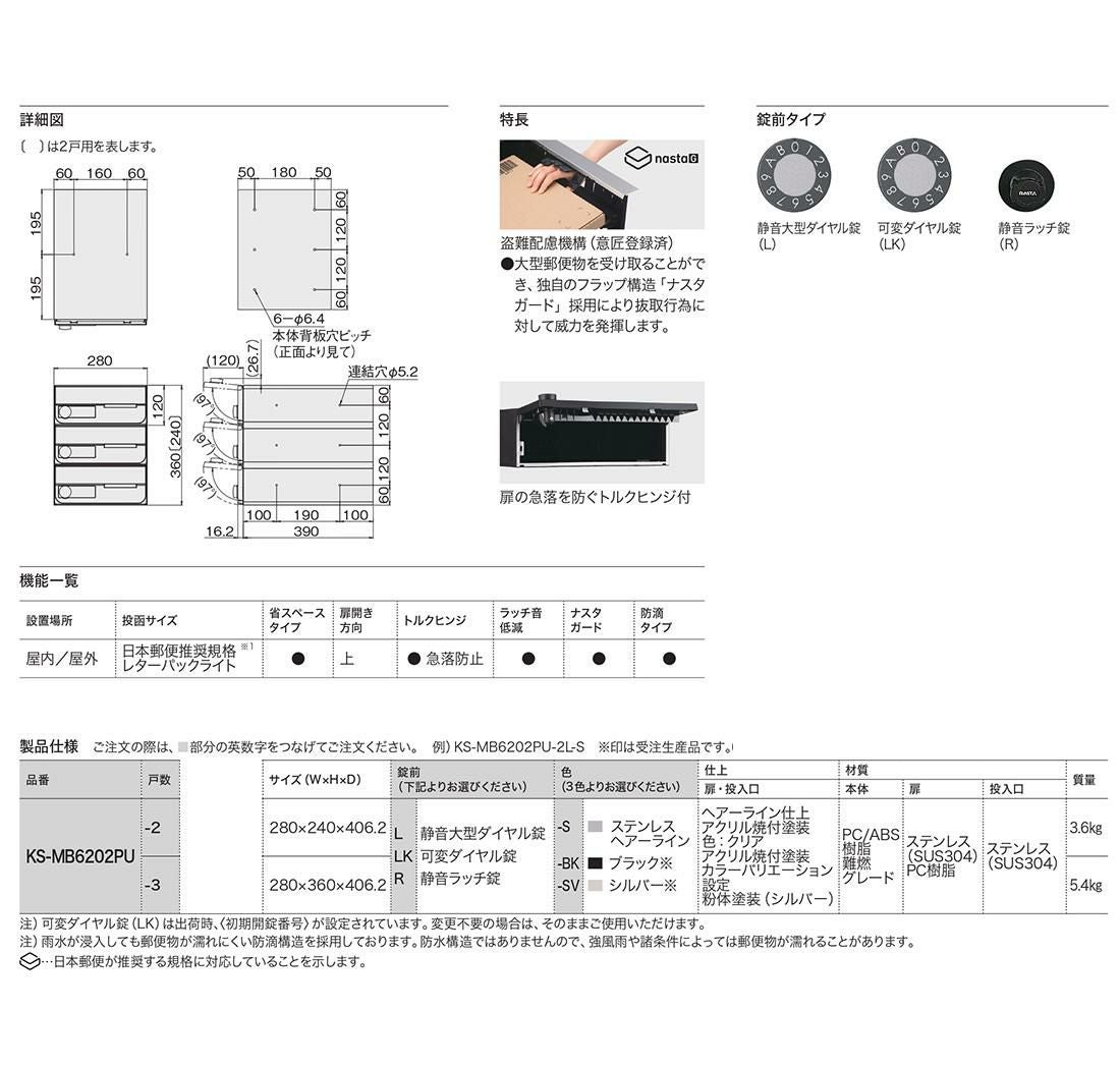 「ダイヤル錠」や「プッシュ錠」搭載のポストは、ポスト自体で操作が可能で、鍵の持ち運びが不要なので人気が高いですが、開錠番号をわすれてしまうと開けられなくなってしまう事があります。逆に「シリンダー錠」や「カードキー(電子キー)」搭載のポストは、鍵の持ち運びが必要になりますが、開錠番号を覚える必要はありません。ご自身の使用方法に合わせて最適な機能を選びましょう。 -