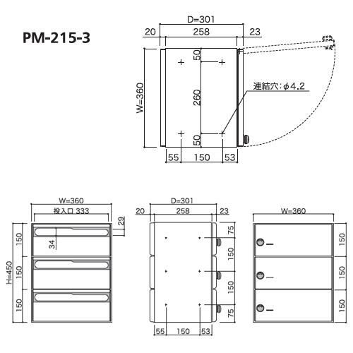 D-ALL 集合住宅用ポスト KS-MB3102PU-3LKT 可変ダイヤル錠 前入れ後出し 3戸用 タテ型