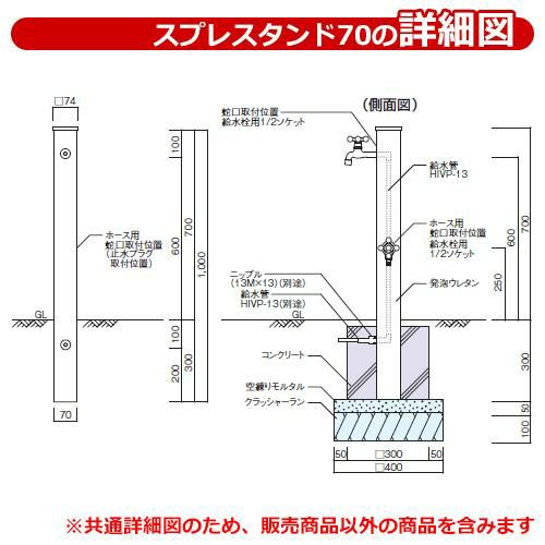 またそれぞれ「蛇口なし」「蛇口1個セット」「蛇口2個セット」等のセットがあり、「蛇口なし」「蛇口1個セット」には、止水プラグが付属されており一口水栓柱としてスプレスタンドを使用することも可能です。