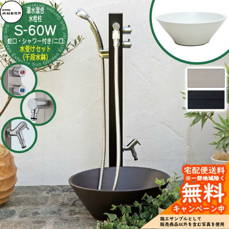 S-60WW 2口 蛇口・シャワー付水栓柱+水受け【千段水鉢 立水栓セット】