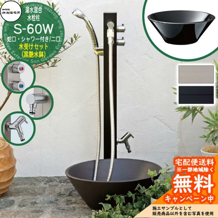 S-60WW 2口 蛇口・シャワー付水栓柱+水受け【黒艶水鉢 立水栓セット】