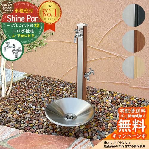 ユニソン スプレスタンド70 蛇口2個セット (木目調) + シャインパン 【ステンレス製 水受け 立水栓セット】