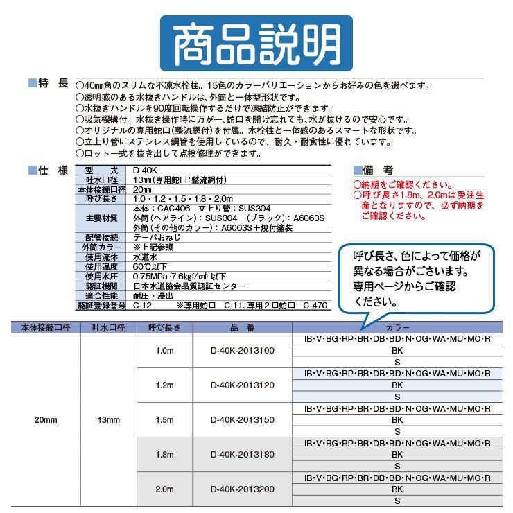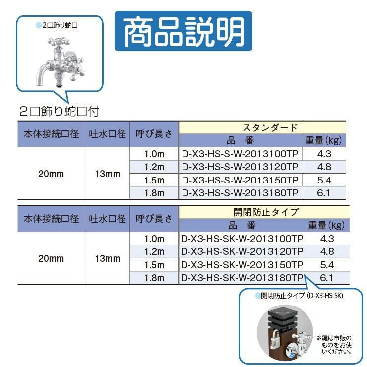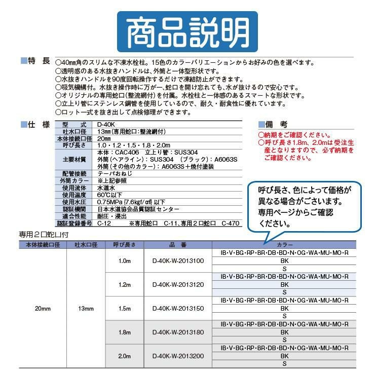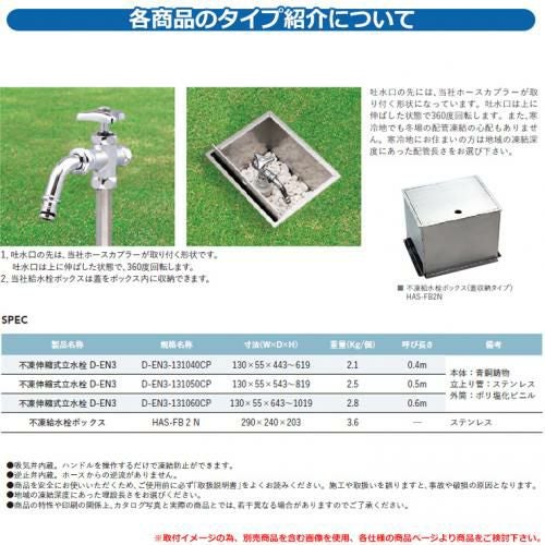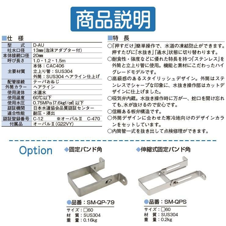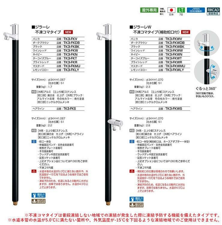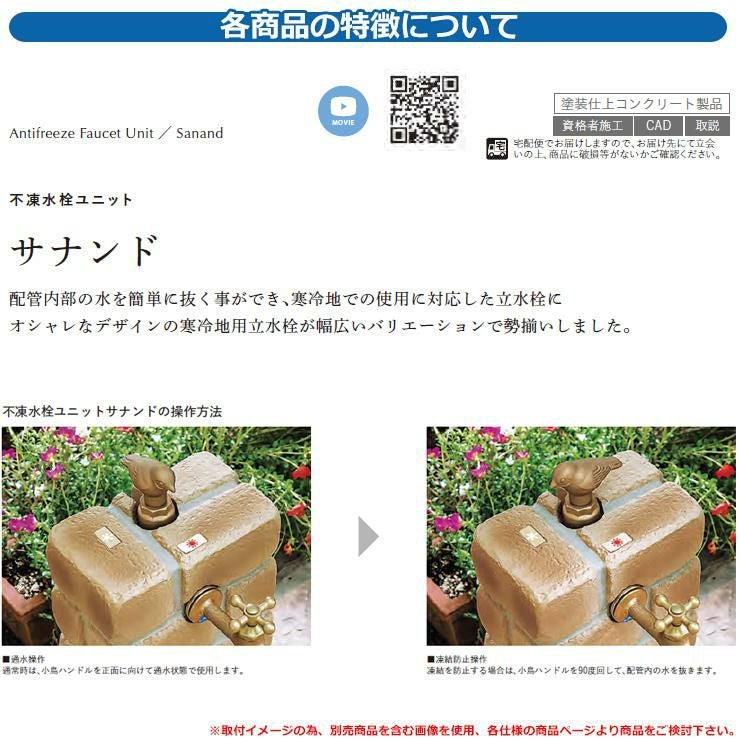 お庭にぴったりの不凍水栓柱・不凍立水栓を見つけるなら、ぜひ当店へ!当店では、不凍水栓を専門に取り扱い、寒冷地に適した立水栓・水栓柱をご提案・ご紹介しております。冬の厳しい寒さによる水道の凍結や破損を防ぐための高品質な不凍水栓を豊富に取り揃えており、凍結地域の悩みを解消する便利な商品を多数ご用意しております。不凍水栓なら、冬でも安心して水を使うことができ、お庭のガーデニングや洗車、雪かき後の水作業などもスムーズに進みます。寒冷地では、水道が凍結すると使えなくなるだけでなく、配管が破損するリスクもあります。当店では、厳選された最新の商品情報をもとに、お客様にご満足いただける立水栓をご紹介いたします。また、ライフスタイルや寒冷地の環境に合わせた多彩なデザインの立水栓・水栓柱を取り揃えているのも当店の特徴です。シンプルで機能的なものから、お庭のデザインに調和するスタイリッシュなものまで、お好みに合わせてお選びいただけます。「寒冷地に適した水栓を探している」「冬でも安心して使える立水栓がほしい」という方は、ぜひ当店をご利用ください。お庭をもっと快適に、寒冷地でも安心して水を使えるようにするためのこだわりの不凍水栓・水栓柱を多数取り揃えておりますので、きっとご満足いただける商品が見つかるはずです。素敵なお庭づくりと快適な水回りのために、ぜひ当店の不凍水栓・水栓柱をご覧ください!
