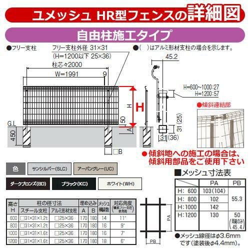 スチールメッシュフェンス ユメッシュHR型 H1000タイプ 呼称:2010 傾斜用 オプションポールのみ 傾斜用スチール支柱