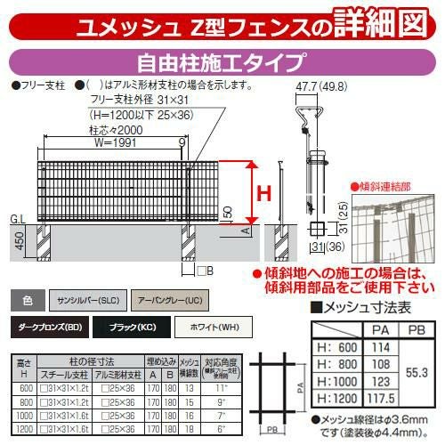 スチールメッシュフェンス ユメッシュZ型 H1000タイプ 呼称:2010 傾斜用 オプションポールのみ 傾斜用スチール支柱