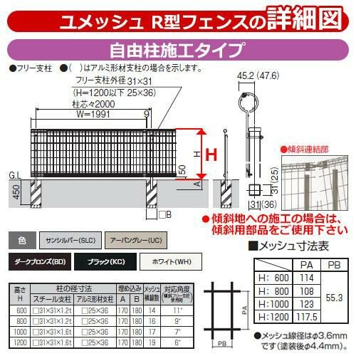 スチールメッシュフェンス ユメッシュR型 H1200タイプ 呼称:2012 オプションポールのみ アルミ形材支柱