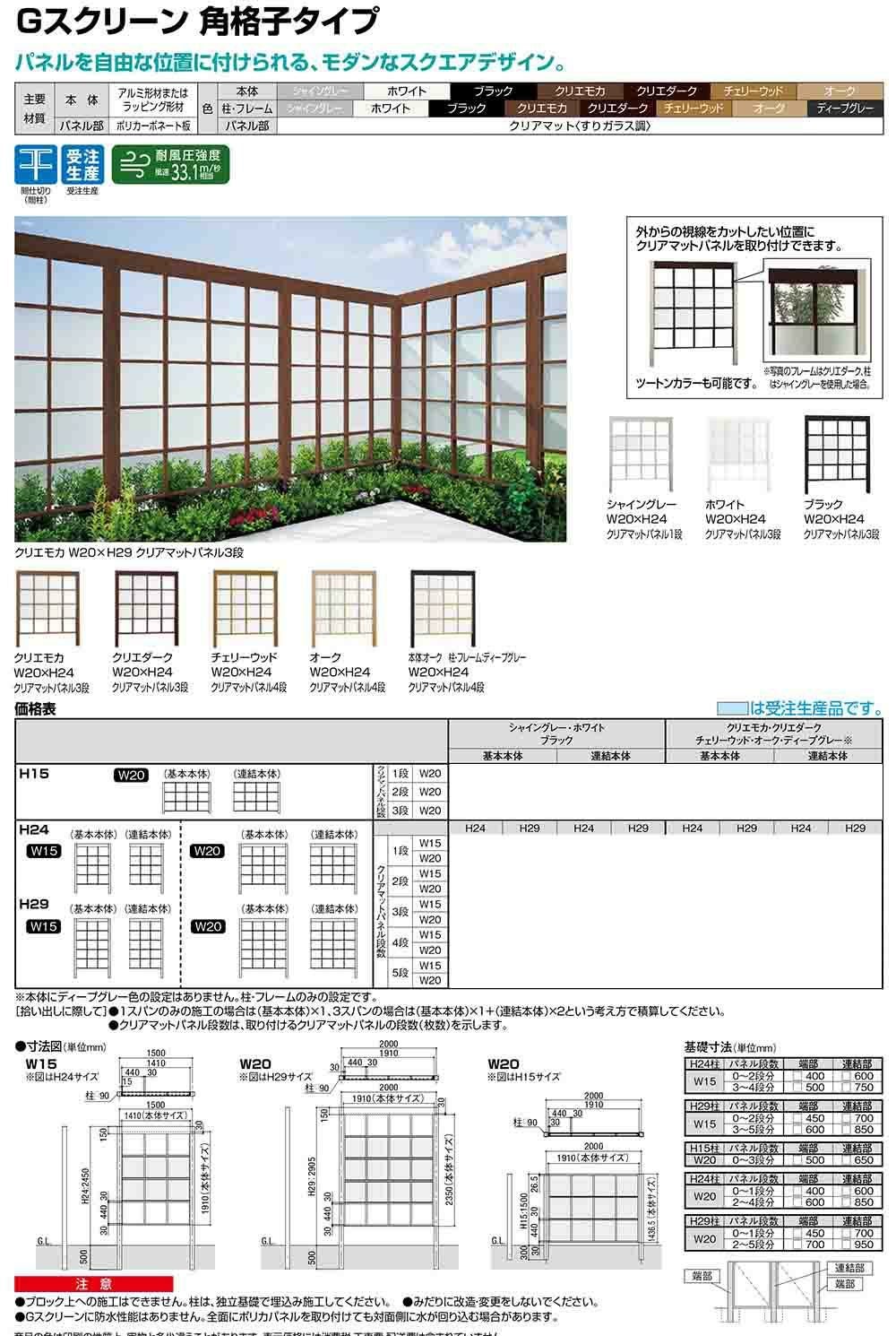 Gスクリーン 角格子タイプ(クリアマットパネル段数:1段) ラッピング形材色 基本本体:H15・W20