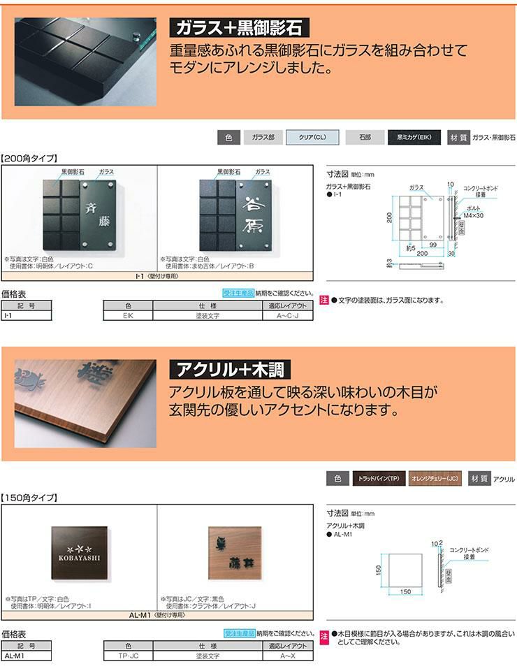 ガラス表札・アクリル表札・ステンレス表札・ストーン表札・木調表札・真鍮表札・タイル表札・ソネット門柱1型・アルディ門柱・マイ門柱SI型(アルミタイプ/デザインタイプ/ポリカタイプ)・マイ門柱(2型/3型/4型)・クレディ門柱(1型/2型/3型)・クレディ門柱(Nタイプ:照明無/Lタイプ:照明付)・パレット門柱(T1型/P1型)・ブルーム門柱M1型・鋳造立体文字プレート 等
