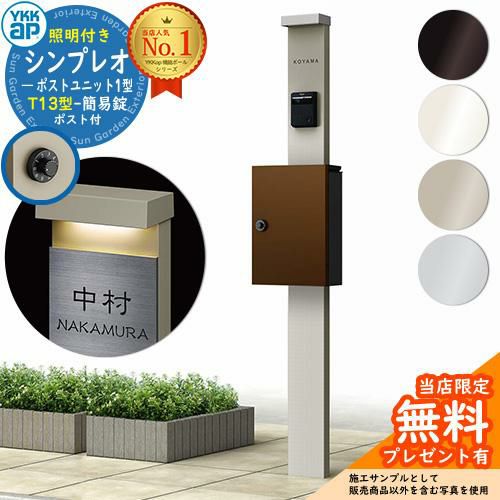 YKKap シンプレオポストユニット 1型 照明付き(100V照明)本体 T13型ポスト(簡易錠) セット 上入れ前出し