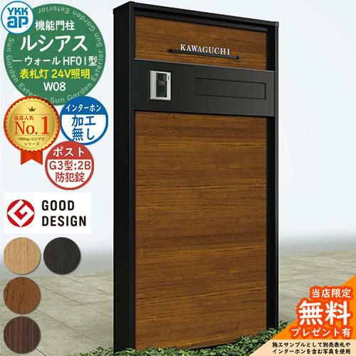 YKKap 機能門柱 ルシアス ウォールHF01型 W08 表札灯タイプ(24V照明) G3型 2B(防犯錠)セット