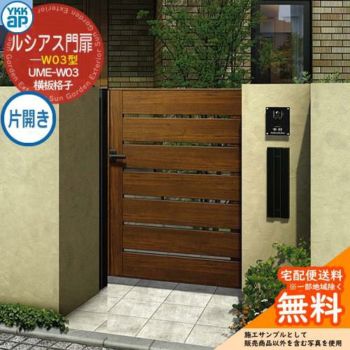 形材門扉 YKKap ルシアス門扉W03型 片開き 門柱仕様 08-12 内開き仕様 UME-W03 門柱:アルミ色 扉:木調色 横板格子 W800×H1200(扉1枚寸法)
