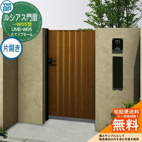 形材門扉 YKKap ルシアス門扉W05型 片開き 門柱仕様 09-14 内開き仕様 UME-W05 門柱:アルミ色 扉:木調色 たてリブモール W900×H1400(扉1枚寸法)