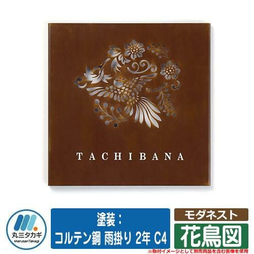 表札 おしゃれ モダネスト 花鳥図 塗装:コルテン鋼 雨掛り 2年 C4 文字色:シルバー