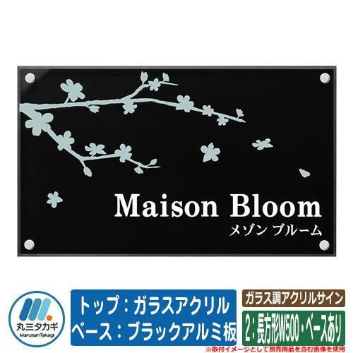 表札 おしゃれ ガラス調アクリルサイン 2:長方形W500・ベースあり トップ:ガラスアクリル ベース:ブラックアルミ板 塗装:文字色:白 デザイン色:素彫り