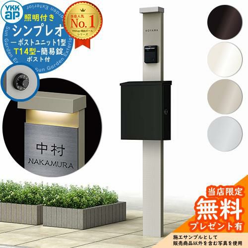 YKKap シンプレオポストユニット 1型 照明付き(100V照明)本体 T14型ポスト(簡易錠) セット 上入れ横出し