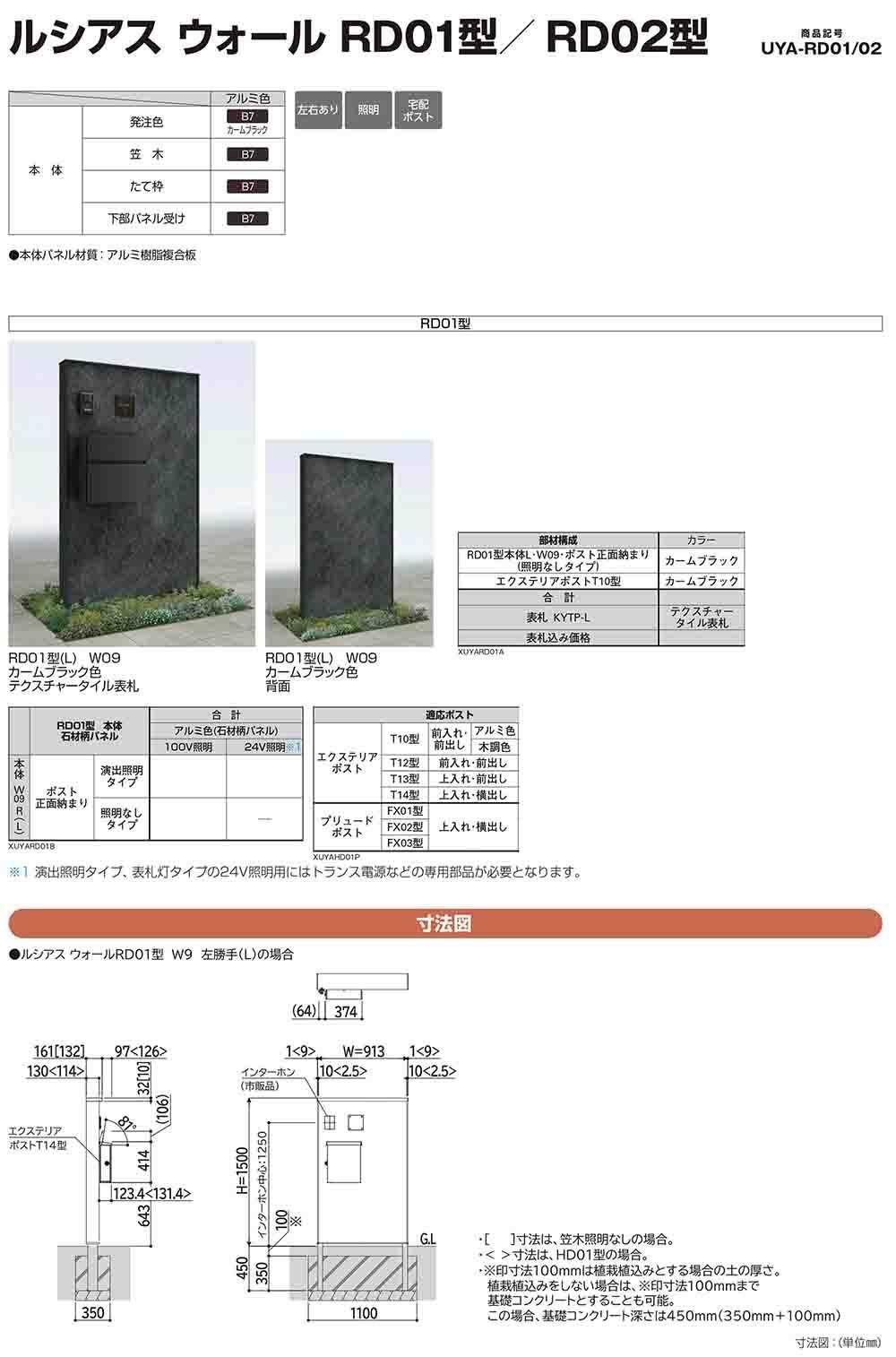 ルシアスウォール RD01型 ポスト正面納まり 演出照明タイプ(24V照明) 本体:アルミ色 エクステリアポストT10型(複合色)