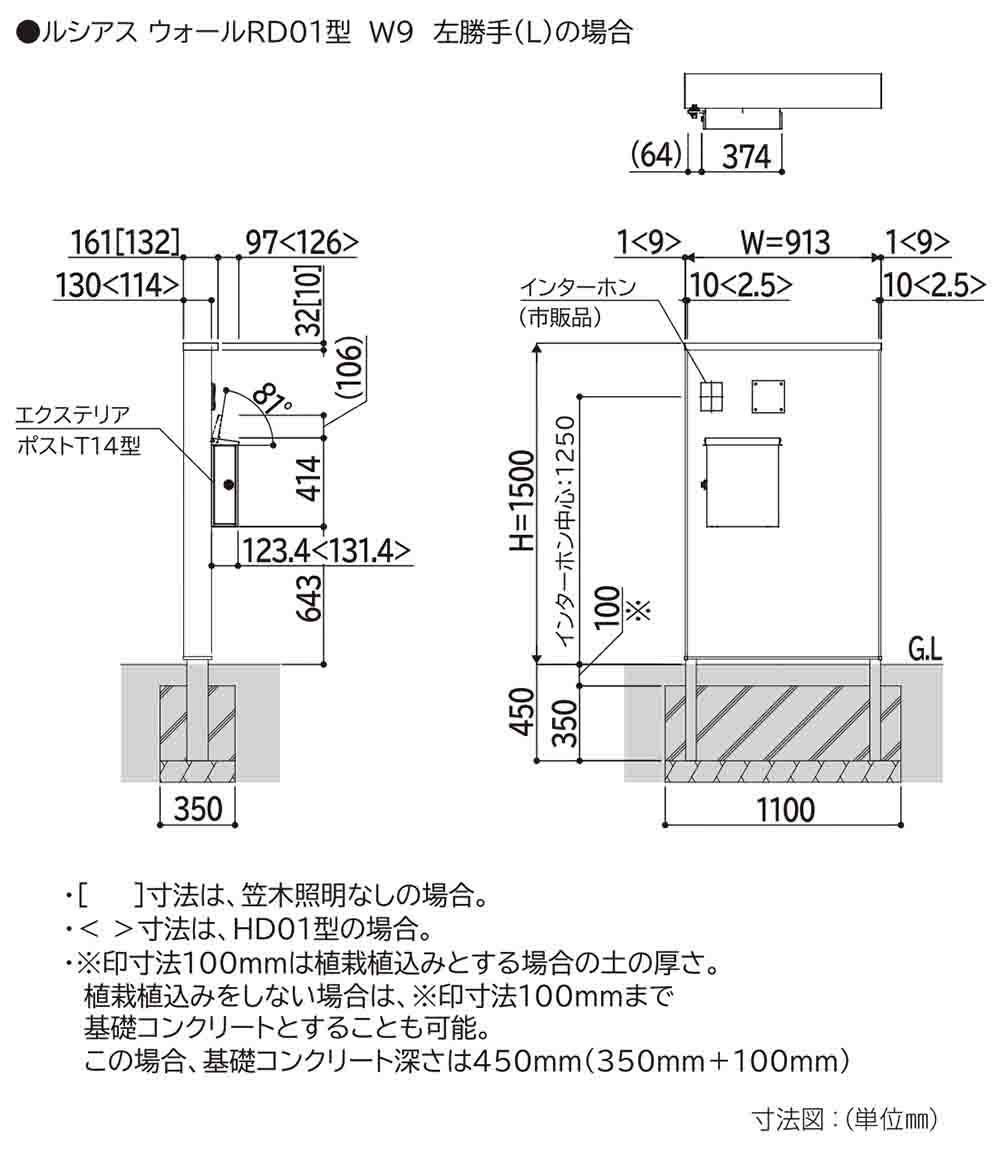 ルシアスウォール RD01型 ポスト正面納まり 照明なしタイプ 本体:アルミ色 エクステリアポストT10型(複合色)