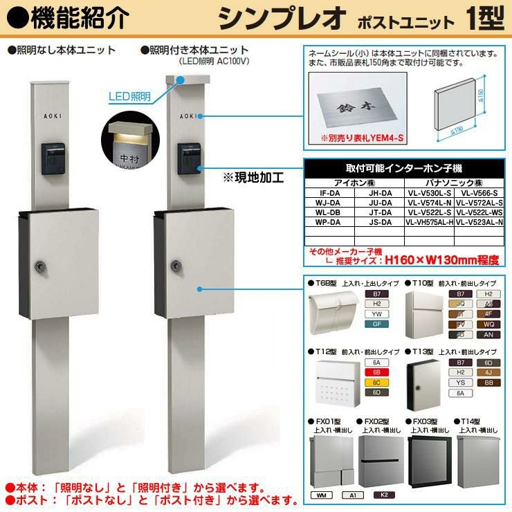 YKKap シンプレオポストユニット 1型 照明付き(100V照明)本体 T10型ポスト(アルミ色) セット 前入れ前出し