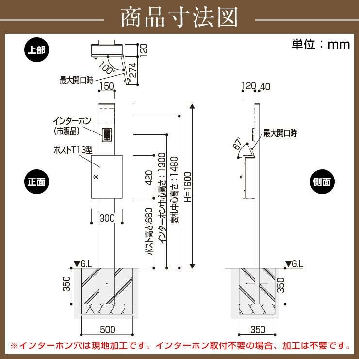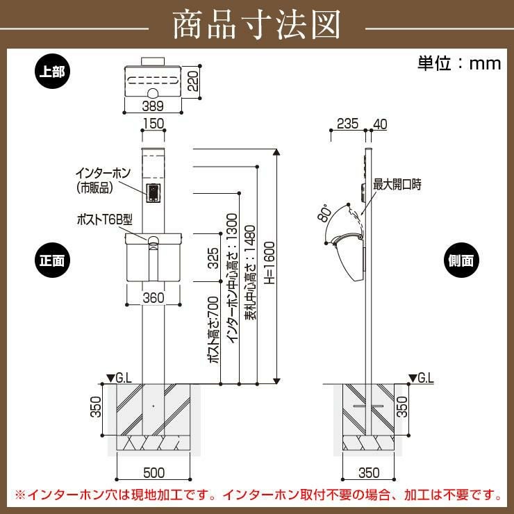 YKKap シンプレオポストユニット 1型 照明付き(100V照明)本体 T6B型ポスト セット 上入れ上出し