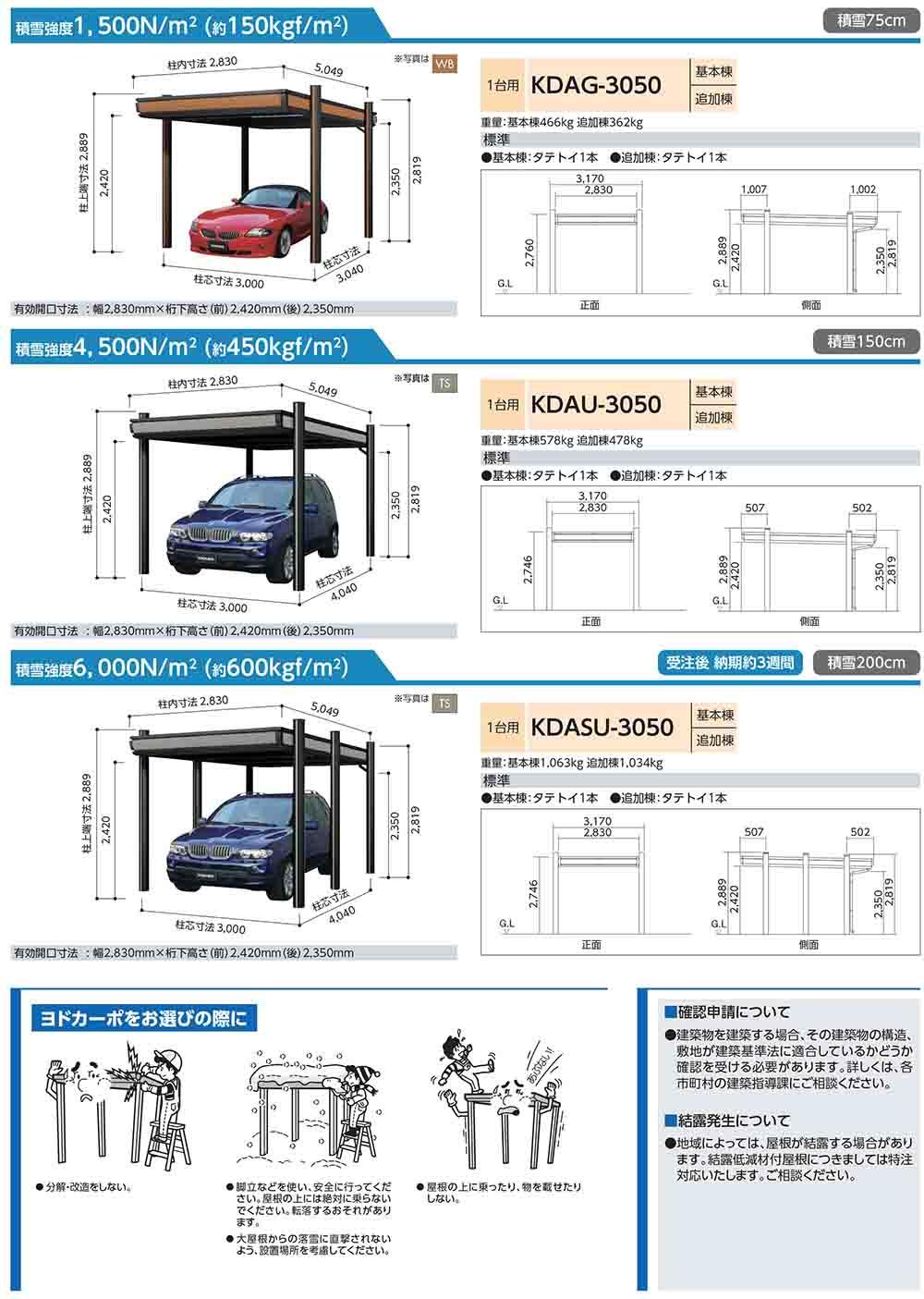 ヨドカーポ パワード カーポート KDAG-3050 収容台数:1台用 積雪強度:1,500N/平米 (約150kgf/平米) 追加棟