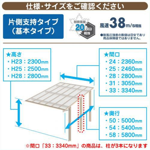 スカイリード 片側支持・基本タイプ H23 呼称:5033 木調屋根枠(パネル材質:ポリカーボネート板) 耐風圧強度:風速38m/s相当
