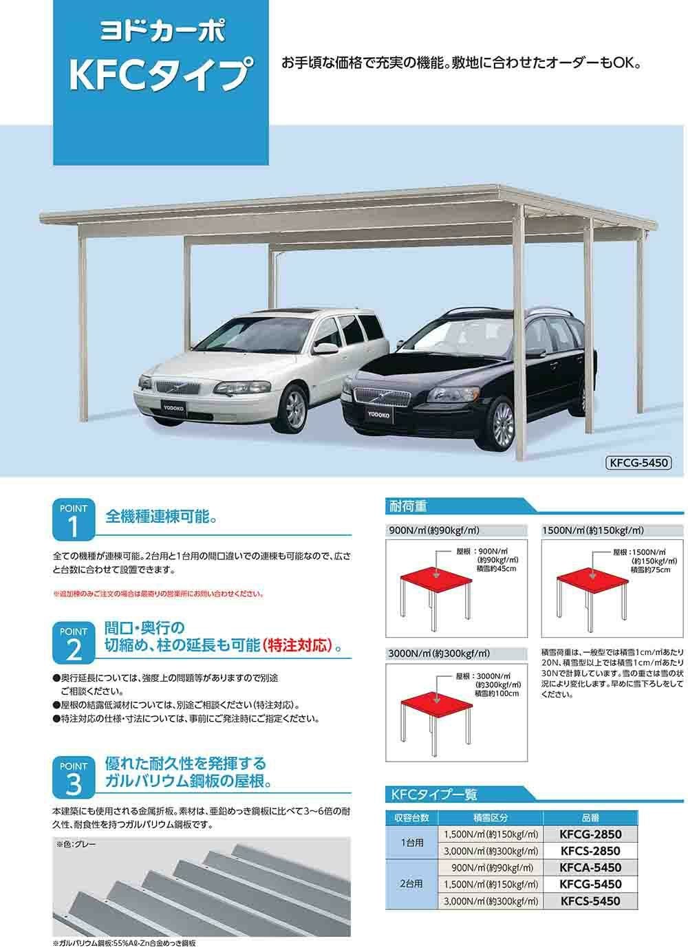 ヨドカーポ KFCタイプ カーポート KFCG-5450 収容台数:2台用 積雪強度:1,500N/平米 (約150kgf/平米) 追加棟