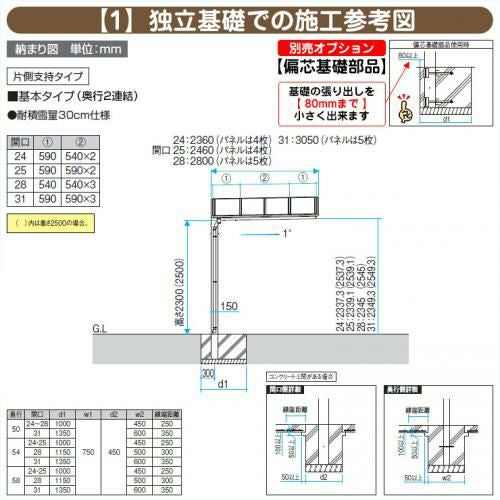 ヨドカーポ KFCタイプ カーポート KFCS-2850 収容台数:1台用 積雪強度:3,000N/平米 (約300kgf/平米) 追加棟