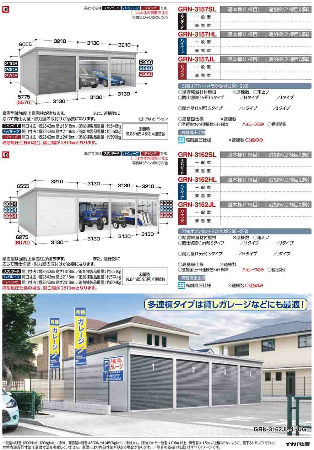 ガレーディア ガレージ GRN-3162JL 3台以上収納タイプ ジャンボ 追加棟(2棟目以降) 一般型 幅3130×奥行6275×高さ2960