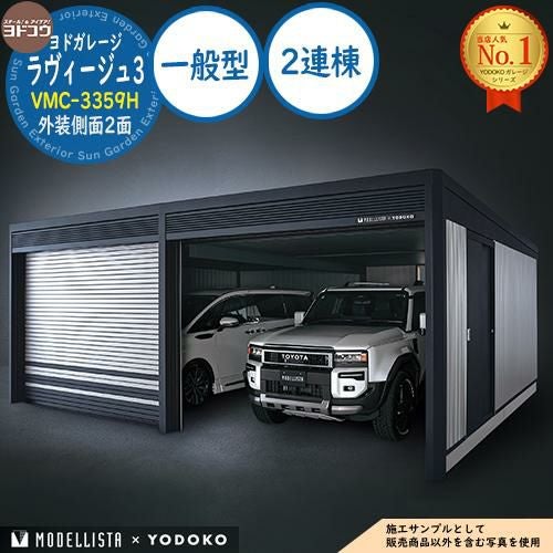 ヨドガレージ ラヴィージュ3 MODELLISTA×YODOKO VMC-3359H 外装側面2面 手動シャッター 2連棟 一般型 間口6707×奥行6088.5×高さ2591