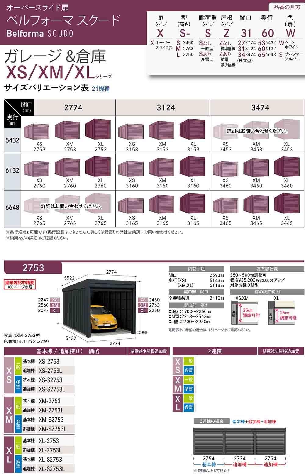 ベルフォーマ スクード オーバースライド扉 Belforma SCUDO ガレージ &倉庫 XM-S2753L 標準屋根 追加棟 多雪型 間口2774×奥行5432×高さ2560