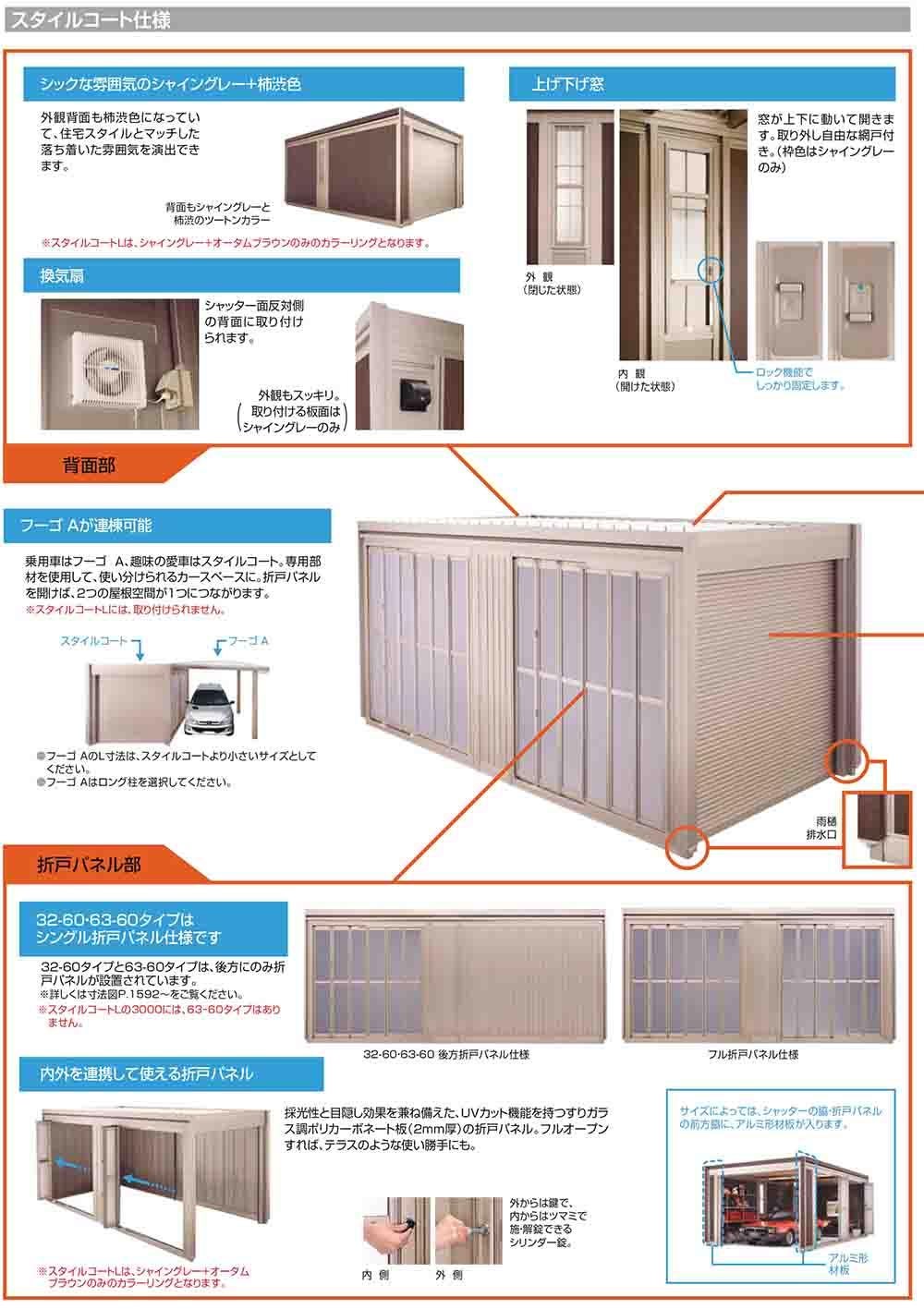 スタイルコートL 32-60 耐積雪タイプ:3000 シングルシャッター仕様 面材機能:ぺフ付き屋根(換気扇対応・上げ下げ窓・目隠し)
