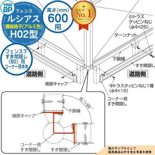 YKKap ルシアスフェンス H02型 H600専用 フェンス下すき間隠し(80)用 コーナー用本体 アルミカラー