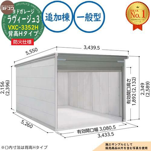 セット内容 ■ヨドガレージ ラヴィージュ3 防火仕様 VXC-3352H シャッタータイプ 背高Hタイプ 追加棟 一般型 間口3433.5×奥行5260×高さ2589