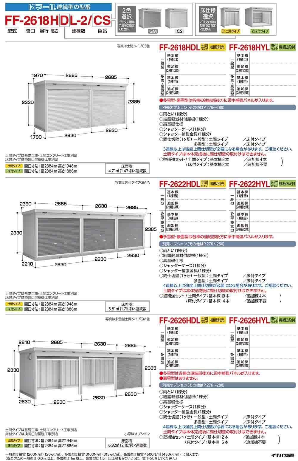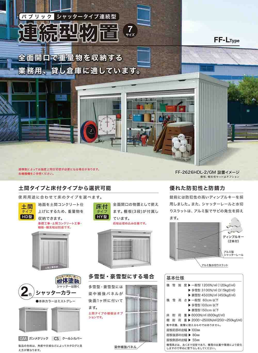 連続型物置 ドマール シャッタータイプ連続型 FF-2630HDL 土間タイプ 基本棟(1連棟) 多雪型・豪雪型 幅2630×奥行3050×高さ2385