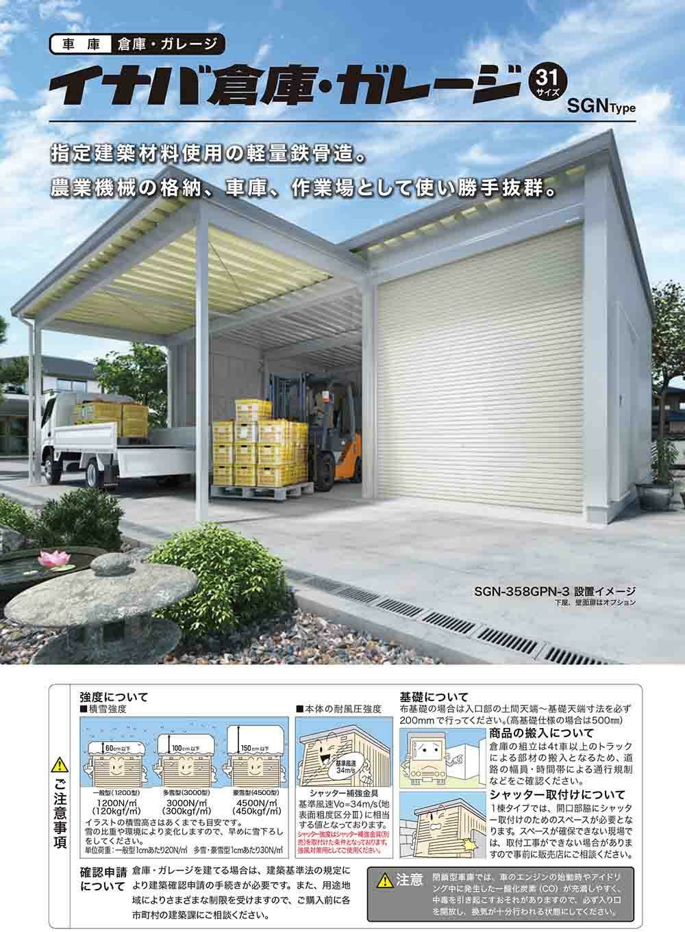 イナバ倉庫・ガレージ SGN-358GYN 布基礎 ジャイアント 1棟タイプ 豪雪型 幅3286×奥行5886×高さ3665
