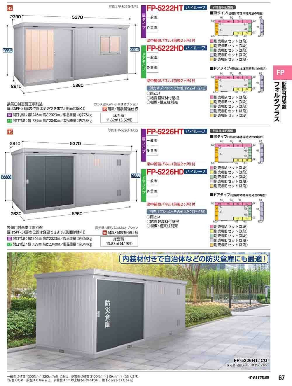 フォルタプラス 断熱材付物置 FP-5222HD(ドアタイプ) ハイルーフ 多雪型 幅5260×奥行2210×高さ2385