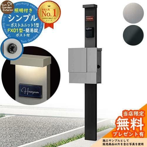 シンプルポストユニット 1型 照明付き(100V照明)本体 FX01型ポスト(簡易錠) セット 上入れ横出し