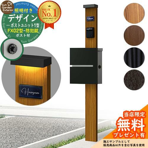 機能門柱 デザインポストユニット1型 照明付き(100V照明) FX02型ポスト(防犯錠)セット