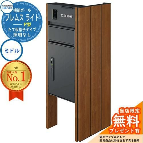 機能ポール フレムス Light サイドスクリーン付きタイプ たて板格子タイプ 本体:木調タイプ サイドスクリーン:木調色 照明なし 【P型】宅配ボックス:ミドル