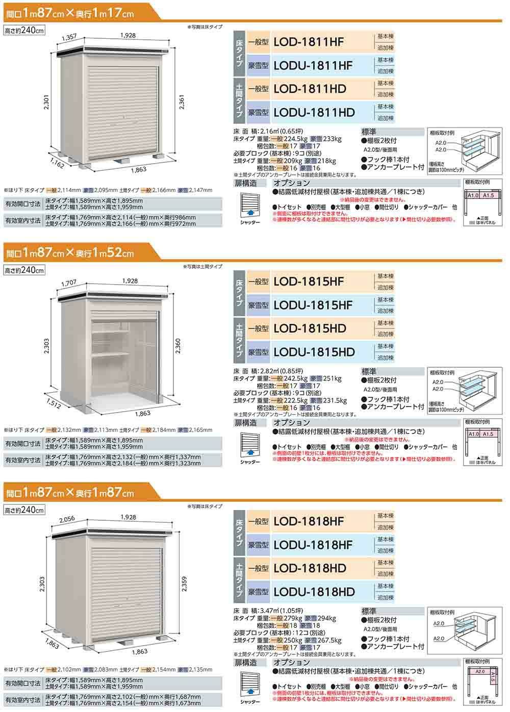 エルモシャッター 中・大型物置 LOD-1815HD 土間タイプ 基本棟 一般型 間口1863×奥行1512×高さ2360