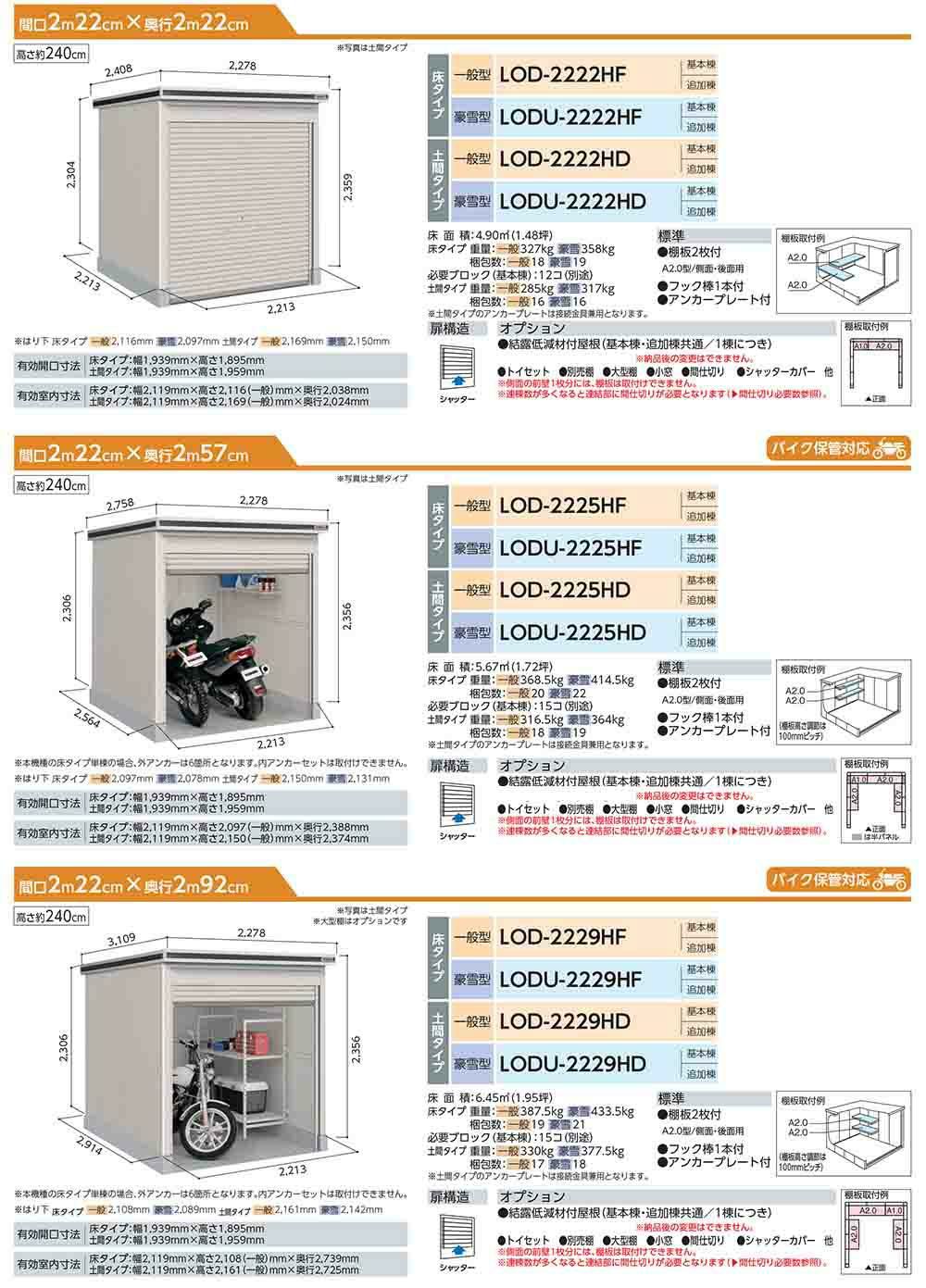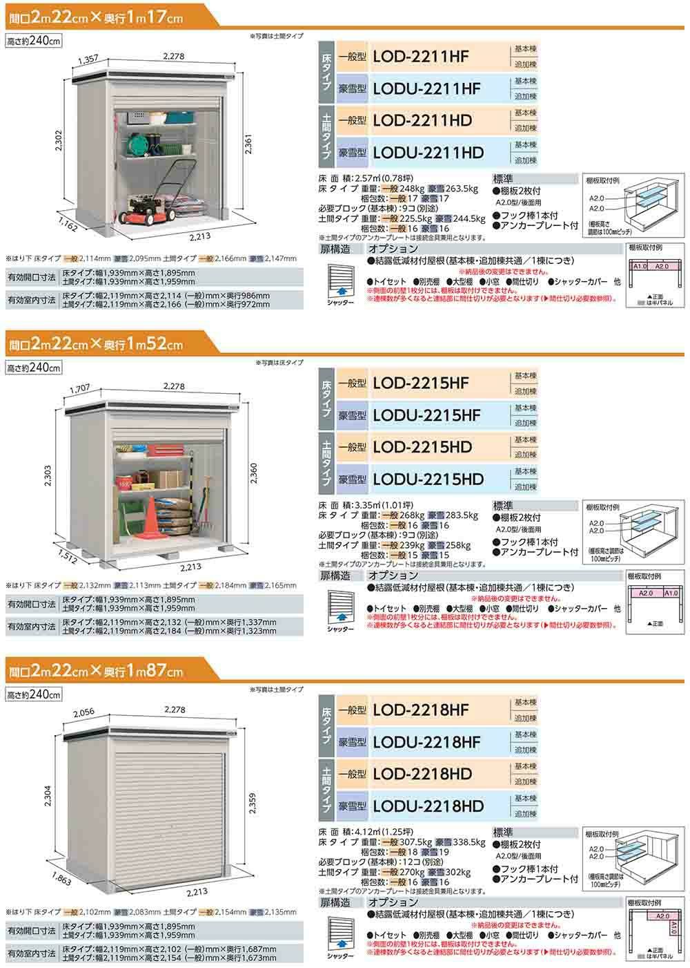 エルモシャッター 中・大型物置 LOD-2218HD 土間タイプ 基本棟 一般型 間口2213×奥行1863×高さ2359