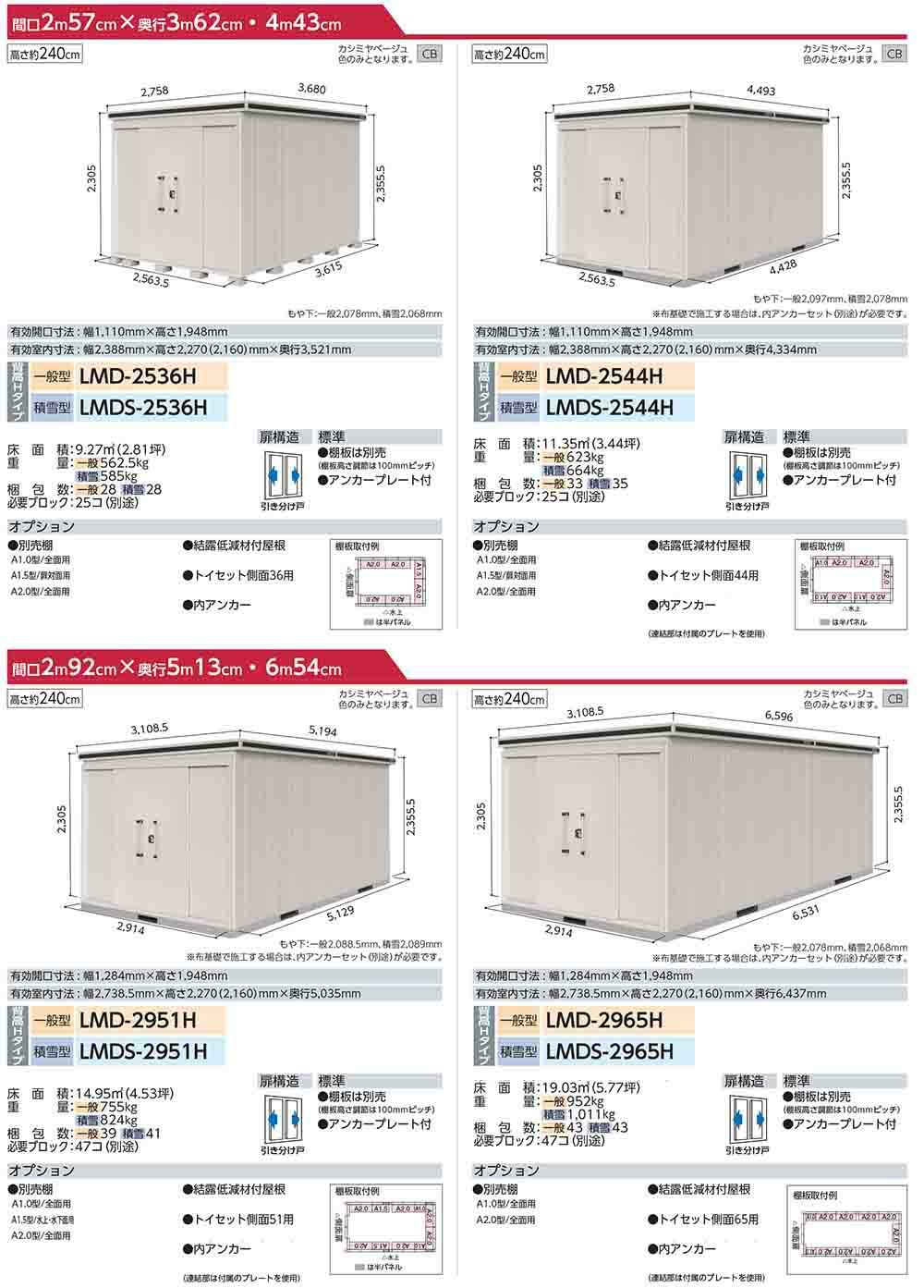 エルモ 中・大型物置 LMDS-5825HL 連結タイプ センター引き分け戸 背高Hタイプ 扉位置:左側 積雪型 間口5830×奥行2564×高さ2356
