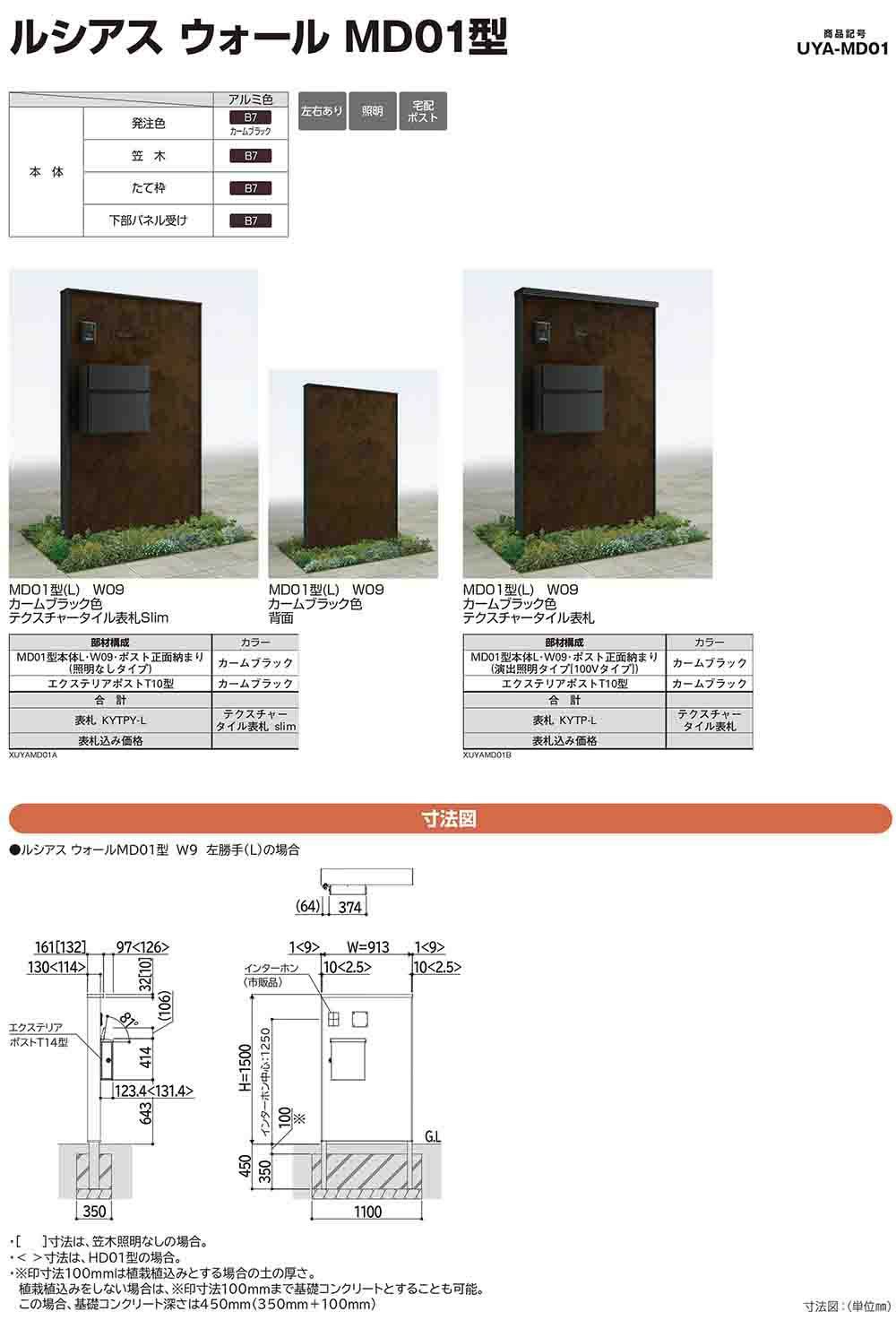 ルシアスウォール MD01型 ポスト正面納まり 照明なしタイプ 本体:アルミ色 エクステリアポストT10型(複合色)