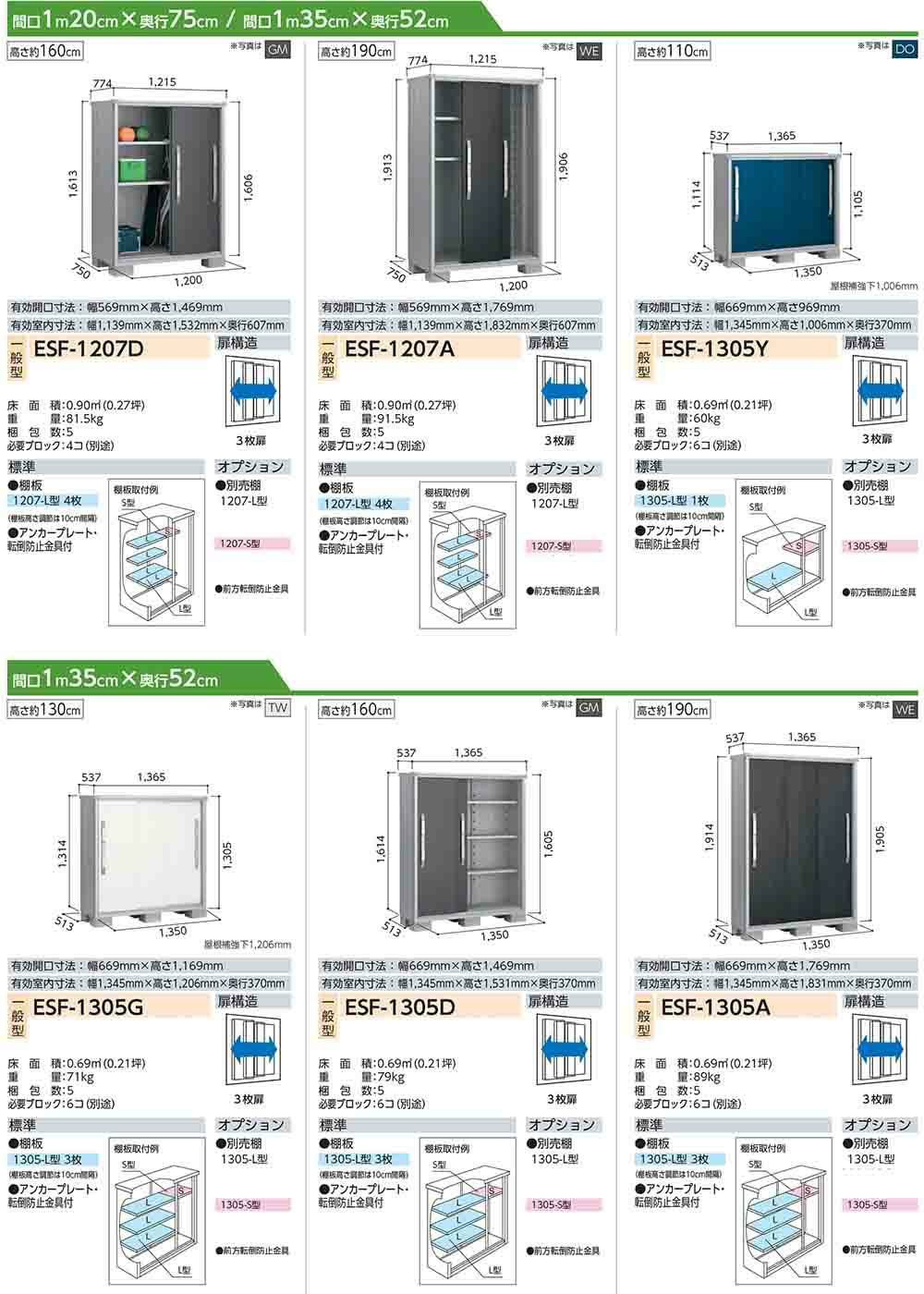 エスモ 小型物置 ESF-1307G 3枚扉タイプ 間口1350×奥行750×高さ1313