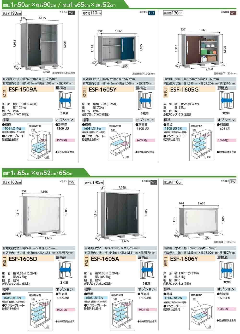 エスモ 小型物置 ESF-1605Y 3枚扉タイプ 間口1650×奥行513×高さ1114