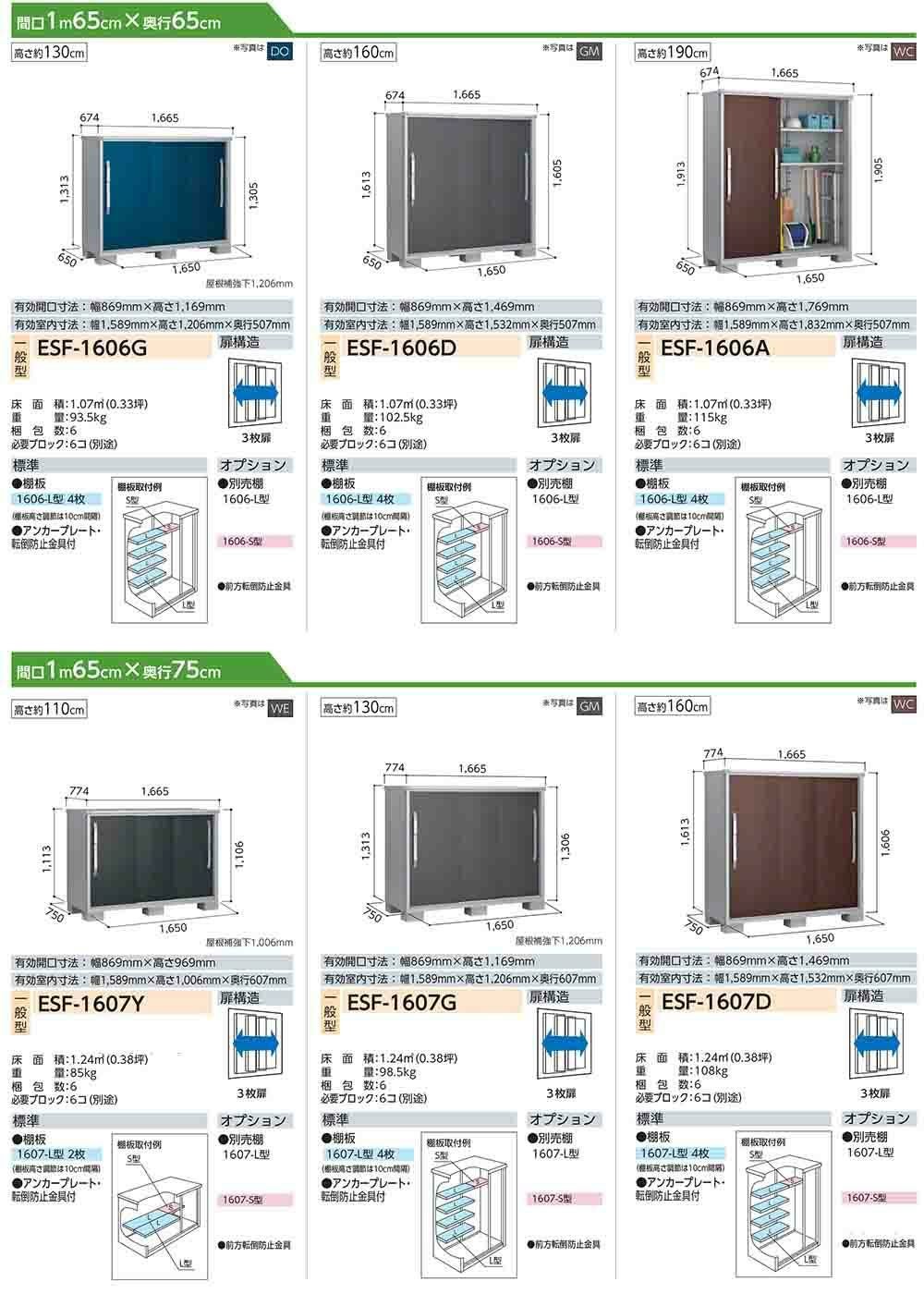 エスモ 小型物置 ESF-1606Y 3枚扉タイプ 間口1650×奥行650×高さ1113
